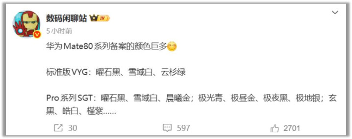 数码博主数码闲聊站再度透露了华为Mate 80系列的配色方案: