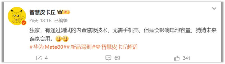 数码博主智慧皮卡丘透露,华为Mate 80系列开发了内置磁吸技术。该技术已在实验室完成测试,有望应用于即将发布的新机,从而提升整体用户体验。